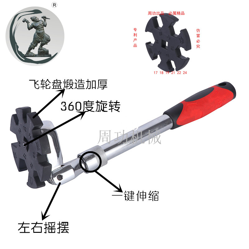 倒鉤槽防滑落、再加360度旋轉和90度左右搖擺、不滑落又能用上力,只要一把扳手難拆銹死的前束螺絲就迎刃而解了。